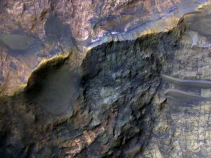 Ancient layered clay-bearing bedrock (top left) and carbonate bedrock (bottom right) are exposed in the central uplift of an unnamed crater approximately 42 kilometers in diameter in eastern Hesperia Planum, Mars. The image was taken by the High Resolution Imaging Science Experiment (HiRISE) instrument aboard the Mars Reconnaissance Orbiter. Credit: NASA/JPL/University of Arizona.