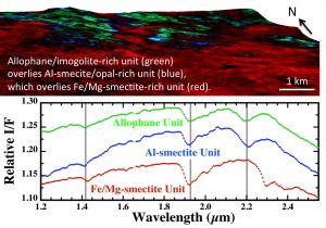 Two kinds of spectral images were used from Martian orbiters: data from the visible/near-infrared CRISM (Compact Reconnaissance Imaging Spectrometer for Mars) instrument on the Mars Reconnaissance Orbiter and data from the thermal-infrared TES (Thermal Emission Spectrometer) instrument on the Mars Global Surveyor orbiter. “The results from these two spectrometers had been conflicting in the past with regard to clay mineral detections, so the agreement reached in this study marks a monumental step forward in our understanding of these important indicators of water on the red planet” says Dr. Bishop. Modeling of the TES data in this new study indicates that about half of the surface rocks in light-toned regions are comprised of clays, silica and poorly crystalline aluminosilicates, which is in agreement with modeling of the CRISM data.View of CRISM image showing allophane/imogolite unit above the crystalline clays.