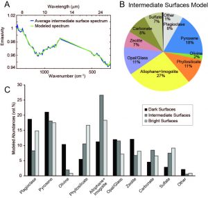 TES model results showing the presence of ~50% poorly crystalline aluminosilicates, phyllosilicates and opal/glass phases, which is comparable to VNIR modeling results indicating ~50% clays.